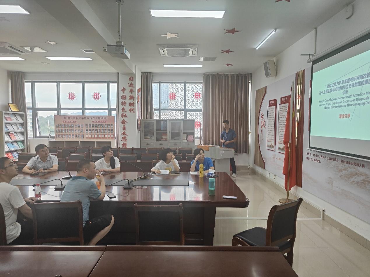 罗旭副院长先介绍了本次学术研讨活动的主要内容。李永彬老师对文献“Graph Convolutional Network with Attention Mechanism Improve Major Depressive Depression Diagnosis Based on Plasma Biomarkers and Neuroimaging Data”进行了阅读分享;强蕾老师对文献“The Association Among Inflammatory Diet, Glycohemoglobin, and Cognitive Function Impairment in the Elderly: Based on the NHANES 2011–2014”和“基于人口社会经济特征和基层医疗机构特征的我国心血管病防控相关人群和地区异质性分析及影响因素探索”进行了深度解析,并对其写作方法进行了总结。罗旭副院长分析了团队成员在临床医学方面的知识欠缺,对如何弥补短板提出了建议。最后,团队成员对存在的困难进行了研讨,罗旭副院长对本次活动进行了总结。