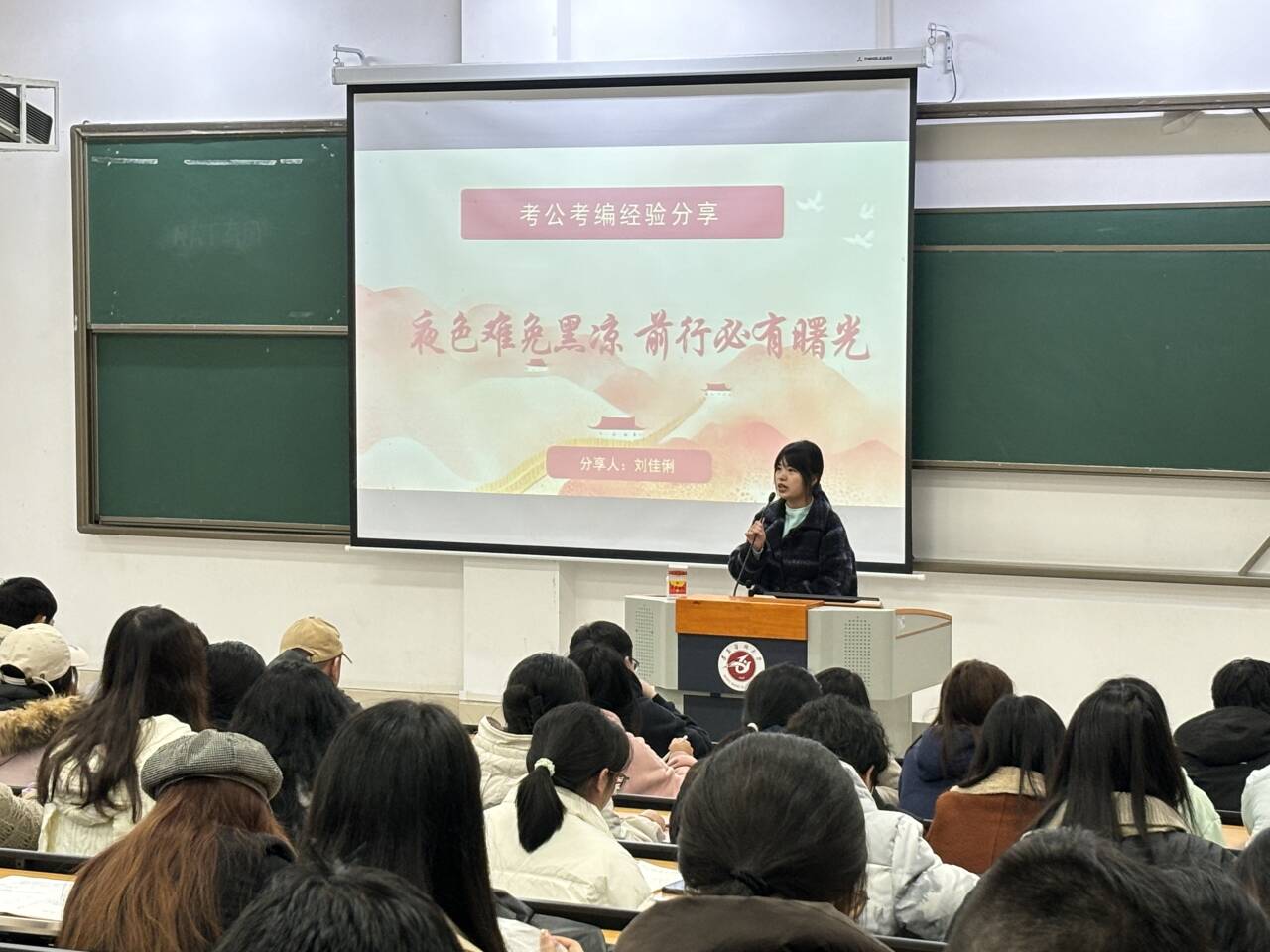 第三个部分,刘佳俐老师围绕国考、省考等考试政策进行全面讲解,逐一梳理报考条件、报名流程、考试科目等核心内容,针对学生关心的岗位选择、备考规划等问题提供针对性指导。鼓励有报考意愿的学生提前制定科学备考计划,明确备考重点,高效投入复习,力争在国考、省考中取得理想成绩。