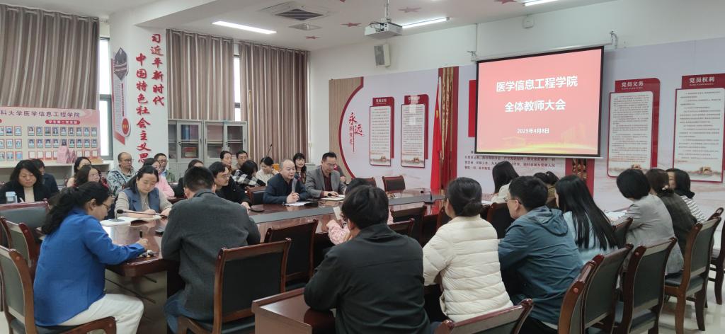 2025年4月8日中午12:30,医学信息工程学院在学院会议室召开全体教师大会,会议内容聚焦学风建设、就业工作、师德师风建设三大主题。会议由学院党委书记李岩主持,学院党委副书记、院长王晓华及其他班子成员、全体教师参加了本次会议。